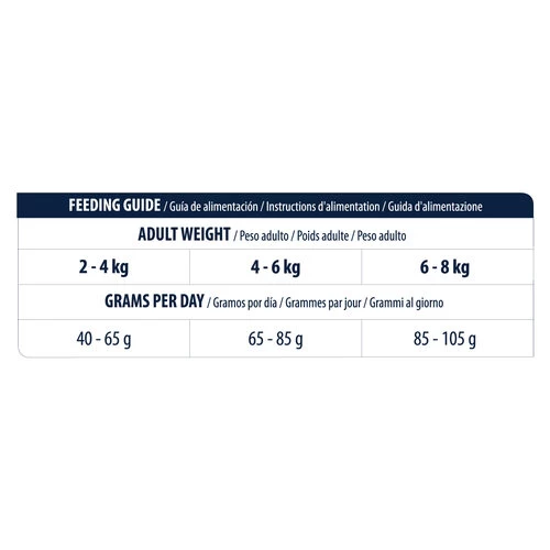 Die angegebenen Futtermengen sind empfohlene Tagesportionen und sollten je nach Alter, Rasse, Wetterbedingungen, Umfang der Bewegung und körperlicher Verfassung angepasst werden. Lagern Sie die Futtermittel an einem kühlen, trockenen Ort, fern vom Boden und direkter Sonneneinstrahlung. Es sollte immer sauberes, frisches Wasser in Reichweite des Tieres stehen.