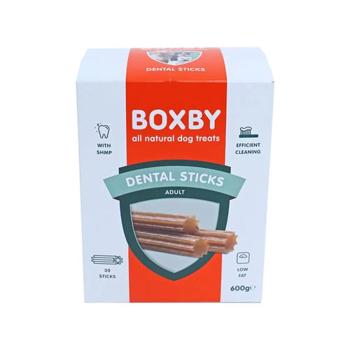 Die Boxby Dental Sticks sind leckere Hundesnacks, die während des Kauens die Zähne Ihres Hundes reinigen und damit zur Gebisspflege beitragen. Die Sticks eignen sich für alle Hunderassen.