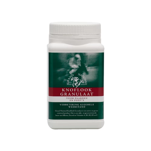 Das Grand National Knoblauchgranulat unterstützt die Abwehrkräfte und die Verdauung von Ihrem Pferd oder Pony. Das Granulat ist angefüllt mit Schwefel, Vitaminen und Allicin, das ein im Knoblauch enthaltenes Antibiotikum ist. Diese Wirkstoffe fördern die Verdauung. Zudem hat das Knoblauchgranulat eine Insekten abwehrende Wirkung. Ein Topf enthält 800 Gramm.